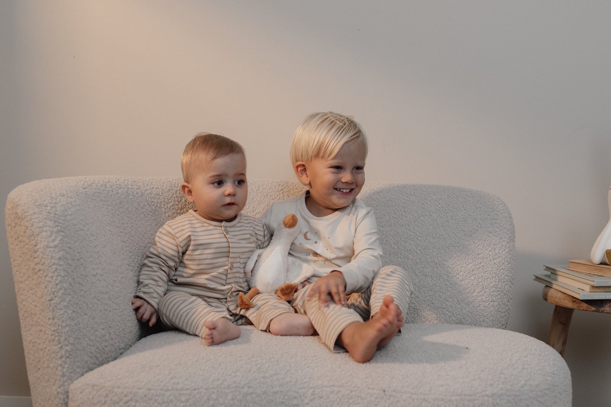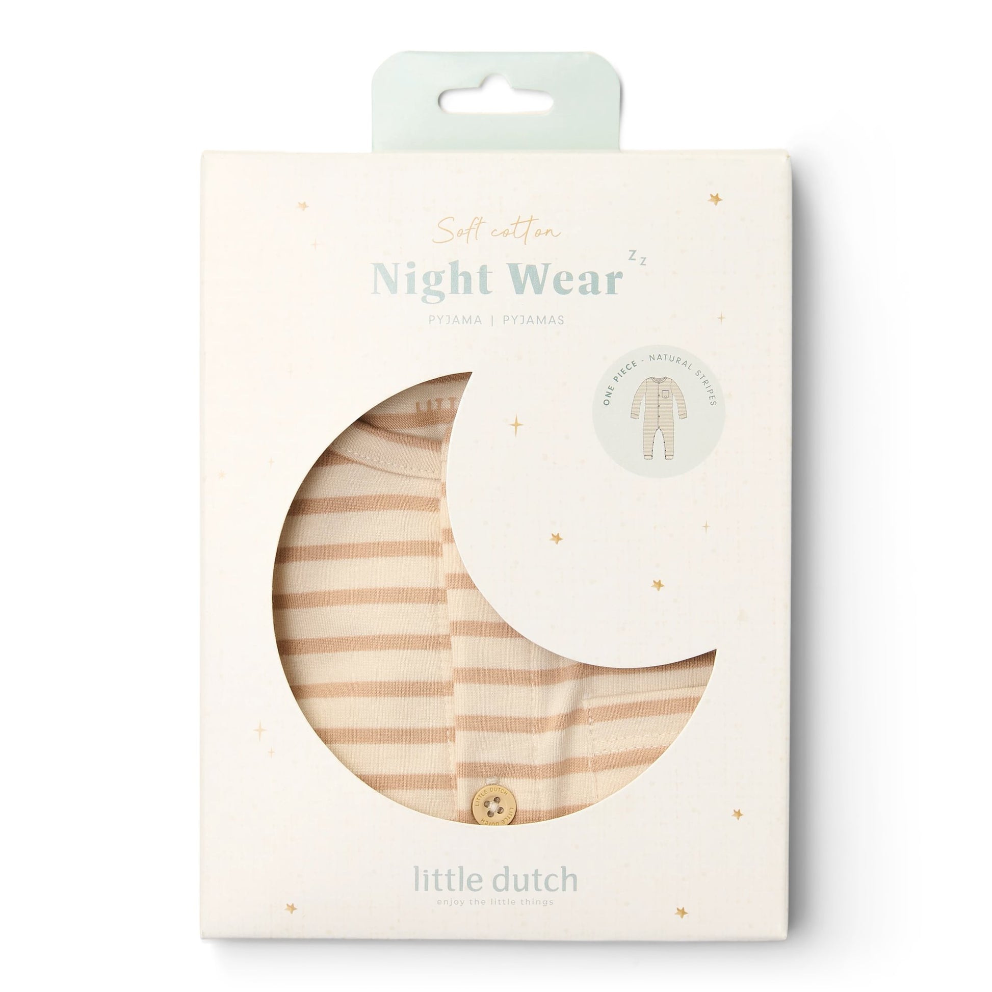 Snooze in streepjes: Dut heerlijk weg in deze zachte gestreepte pyjama's! Deze onesie heeft een klassiek ontwerp met witte en beige streepjes, en combineert comfort met stijl. De pyjama sluit met hout-look knopen aan de voorkant en drukknoopjes bij het kruis zodat het aan- en uitkleden en het verschonen van luiers heel gemakkelijk is. Gemaakt van biologisch katoen voelt deze pyjama zacht aan op de huid van je baby en staat het perfect bij het bijpassende beddengoed. Verpakt in een mooie doos, dus extra leuk om cadeau te geven. Verkrijgbaar in maten 50/56, 62/68 en 74/80.