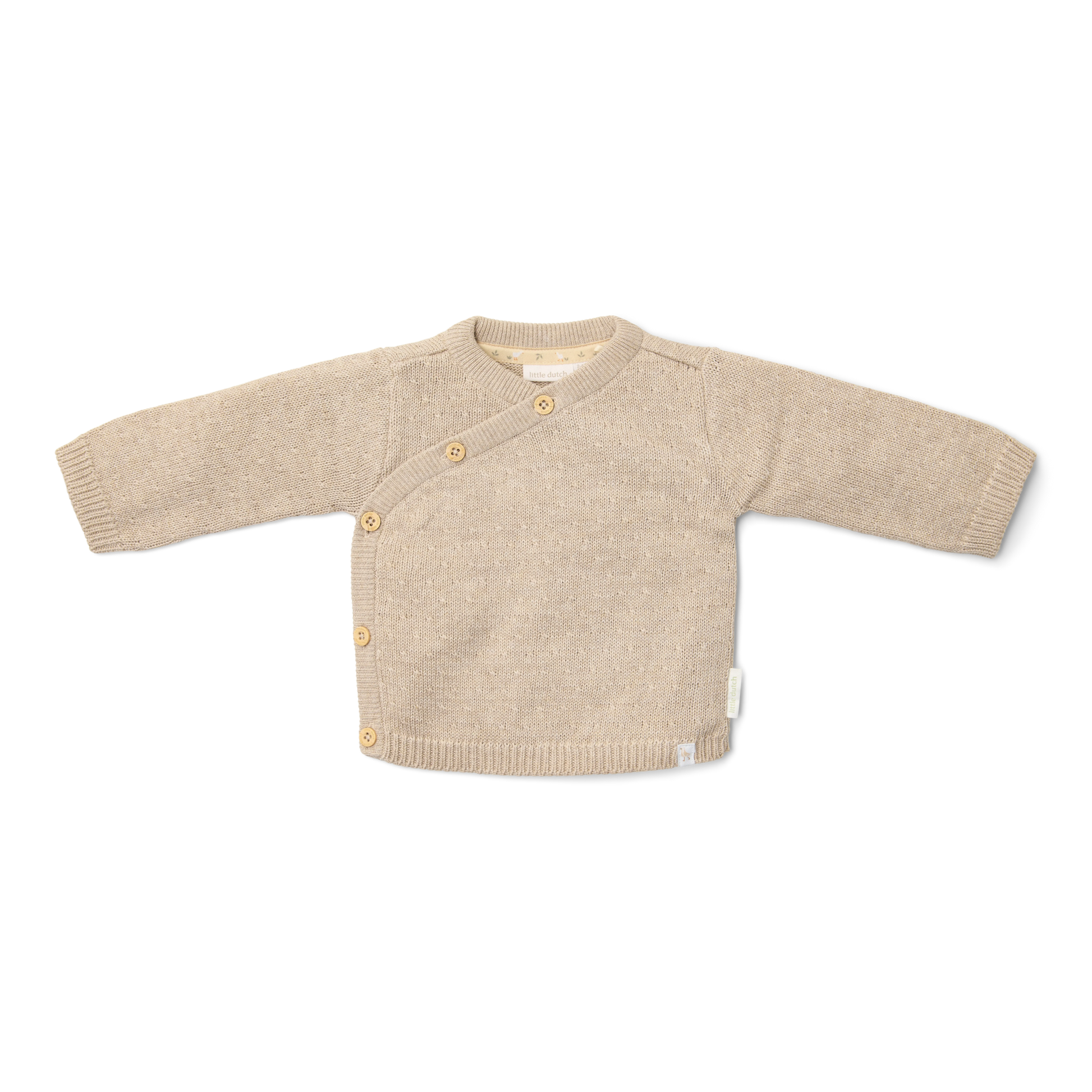 Een heerlijk vest voor de koude dagen! Dit gebreide overslagvest in zandkleurig melange met subtiel stippeneffect is niet alleen zacht, maar ook stijlvol en warm. De charmante houtlookknopen en het overslagontwerp maken aan- en uitkleden gemakkelijk. Gemaakt van biologisch katoen en Oekotex-gecertificeerd, dus je kunt er zeker van zijn dat het vest zacht is voor de huid van je kleintje. Combineer het als set met het bijpassende broekje en de accessoires voor een complete, gezellige outfit. Verkrijgbaar in de maten 44 tot en met 74, voor elk avontuur; groot of klein.