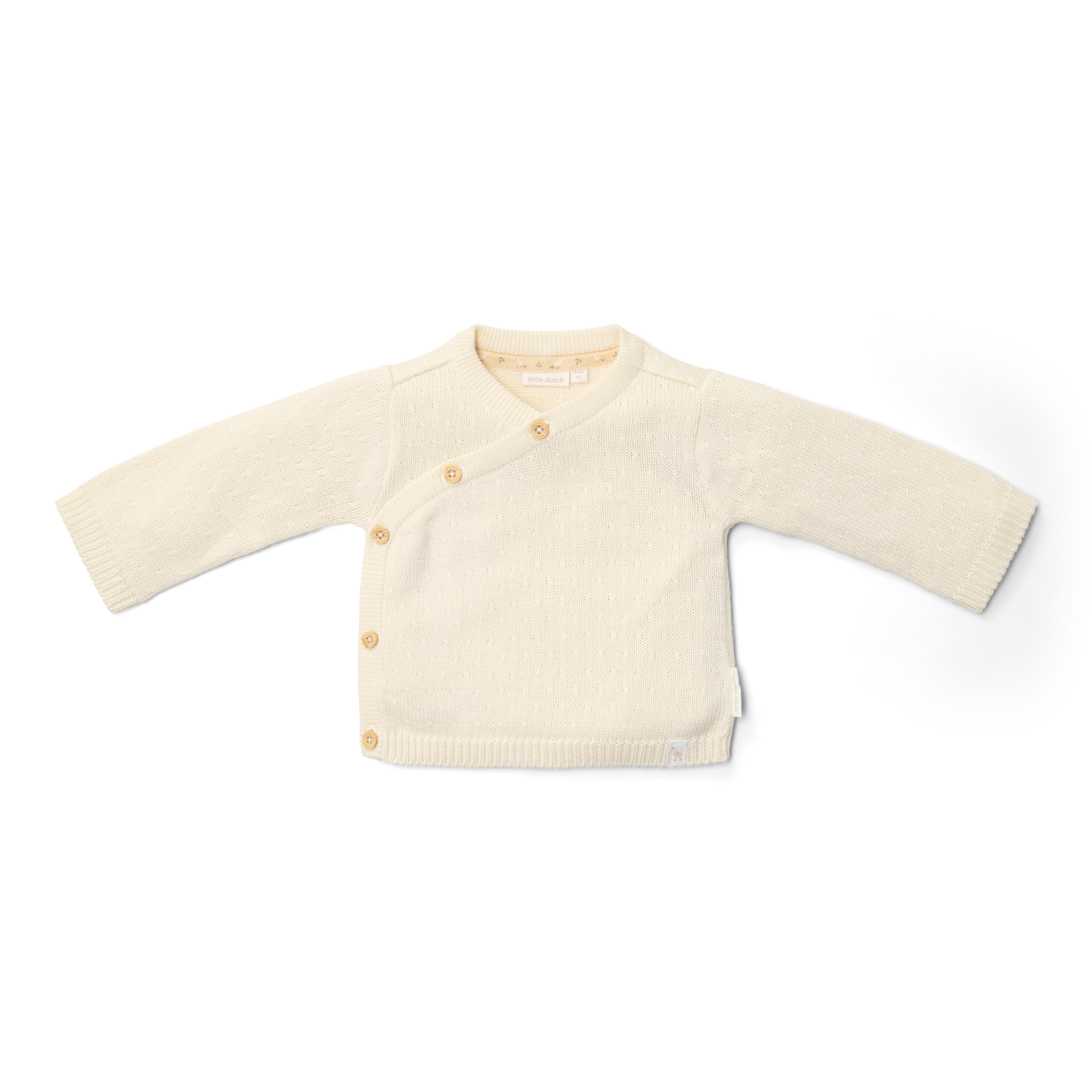 Een heerlijk vest voor de koude dagen! Dit gebreide overslagvest in de kleur Off White met subtiel stippeneffect is niet alleen zacht, maar ook stijlvol en warm. De charmante houtlook knopen en het overslagontwerp maken aan- en uitkleden gemakkelijk. Gemaakt van biologisch katoen en Oekotex-gecertificeerd, dus je kunt erop vertrouwen dat het vestje zacht is voor de huid van je kleintje. Combineer het als set met het bijpassende broekje en de accessoires voor een complete, comfortabele outfit. Verkrijgbaar in de maten 44 tot en met 74, voor elk avontuur; groot of klein.