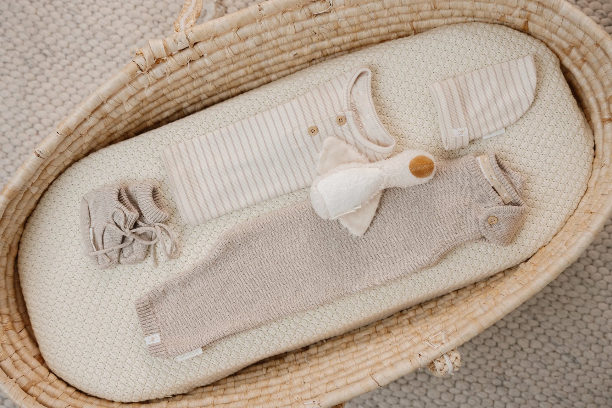Deze zachte, gebreide slofjes in een zachte beige tint zijn perfect voor de kleine voetjes die de wereld nog moeten verkennen. Dankzij de handige touwtjes sluit je ze gemakkelijk aan, zodat ze niet elke keer uitschieten als je kleintje enthousiast trappelt. Geen zorgen meer over verdwijnende slofjes. verkrijgbaar in de maten 44/56 en 62/74. Mix en match met de andere items uit onze newborncollectie.