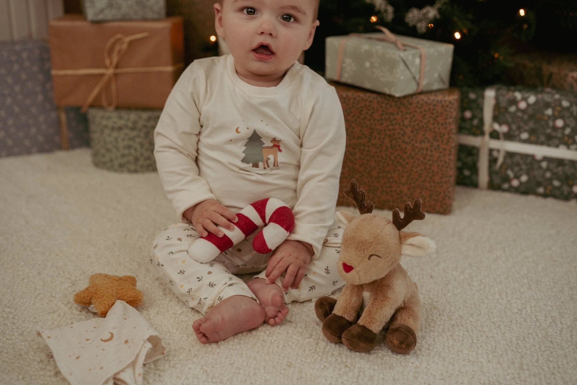 Dit schattige kerstcadeau voor baby's bevat drie zachte producten: een knuffeldoekje met ster, een rammelaar in de vorm van een zuurstok en een lieve rendierknuffel.