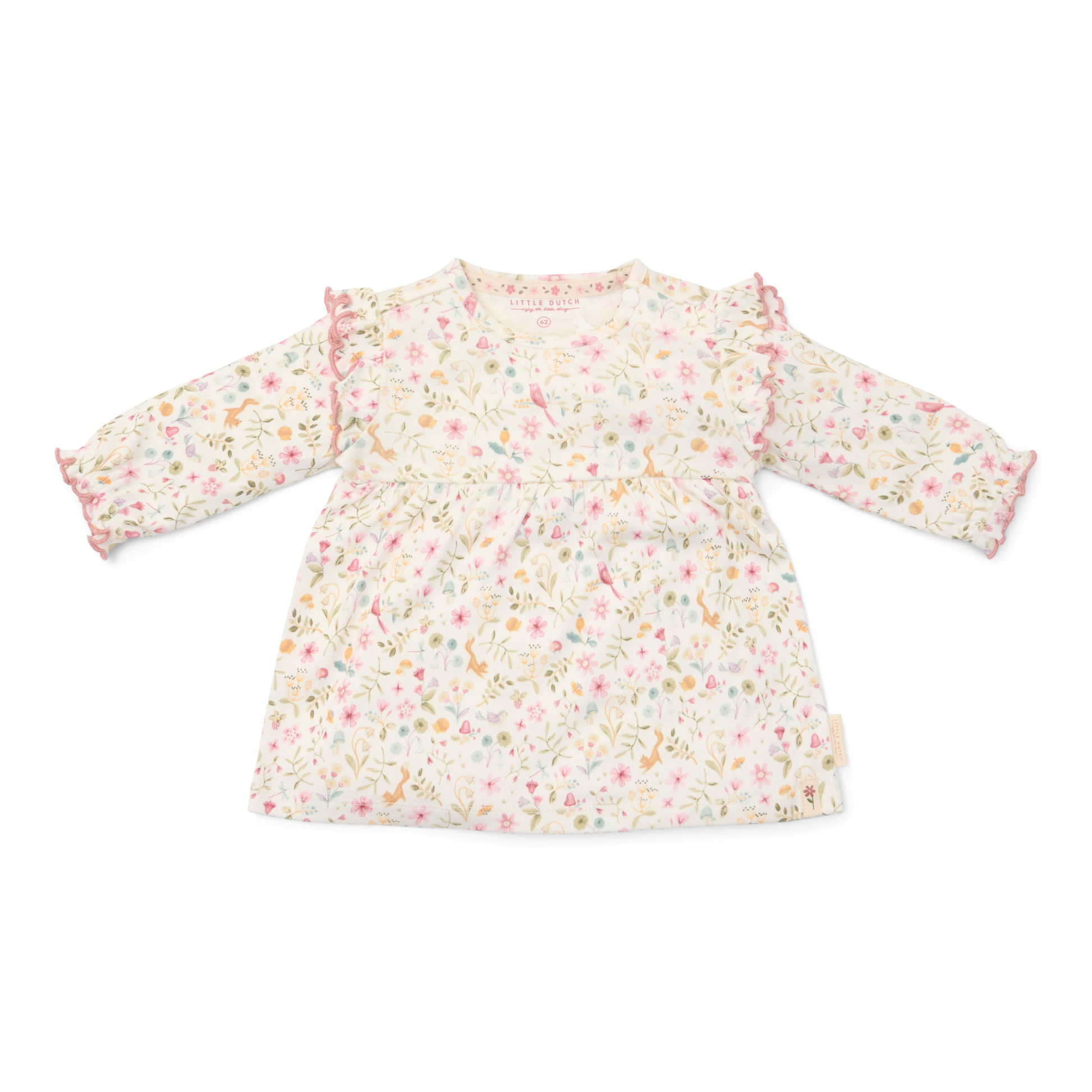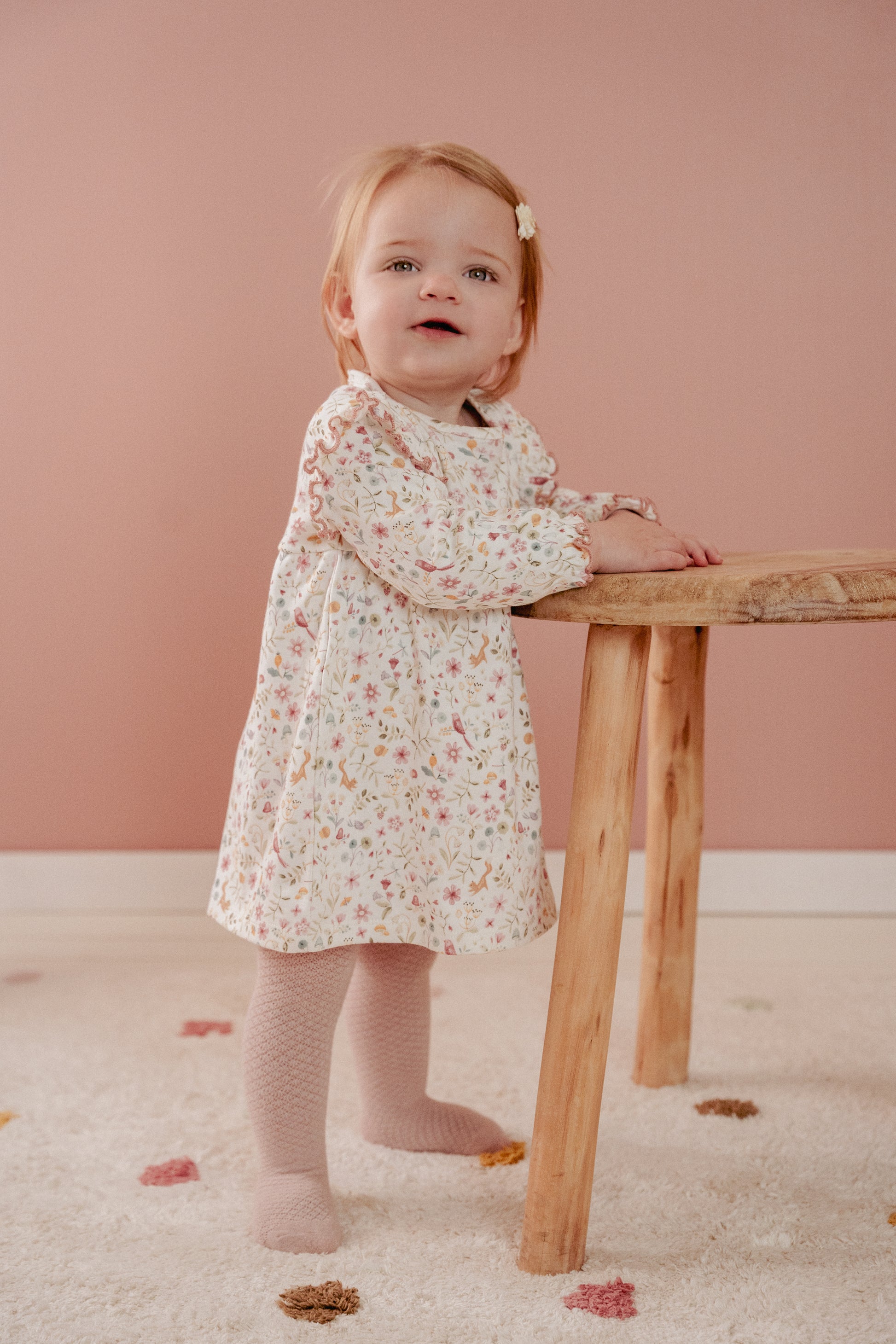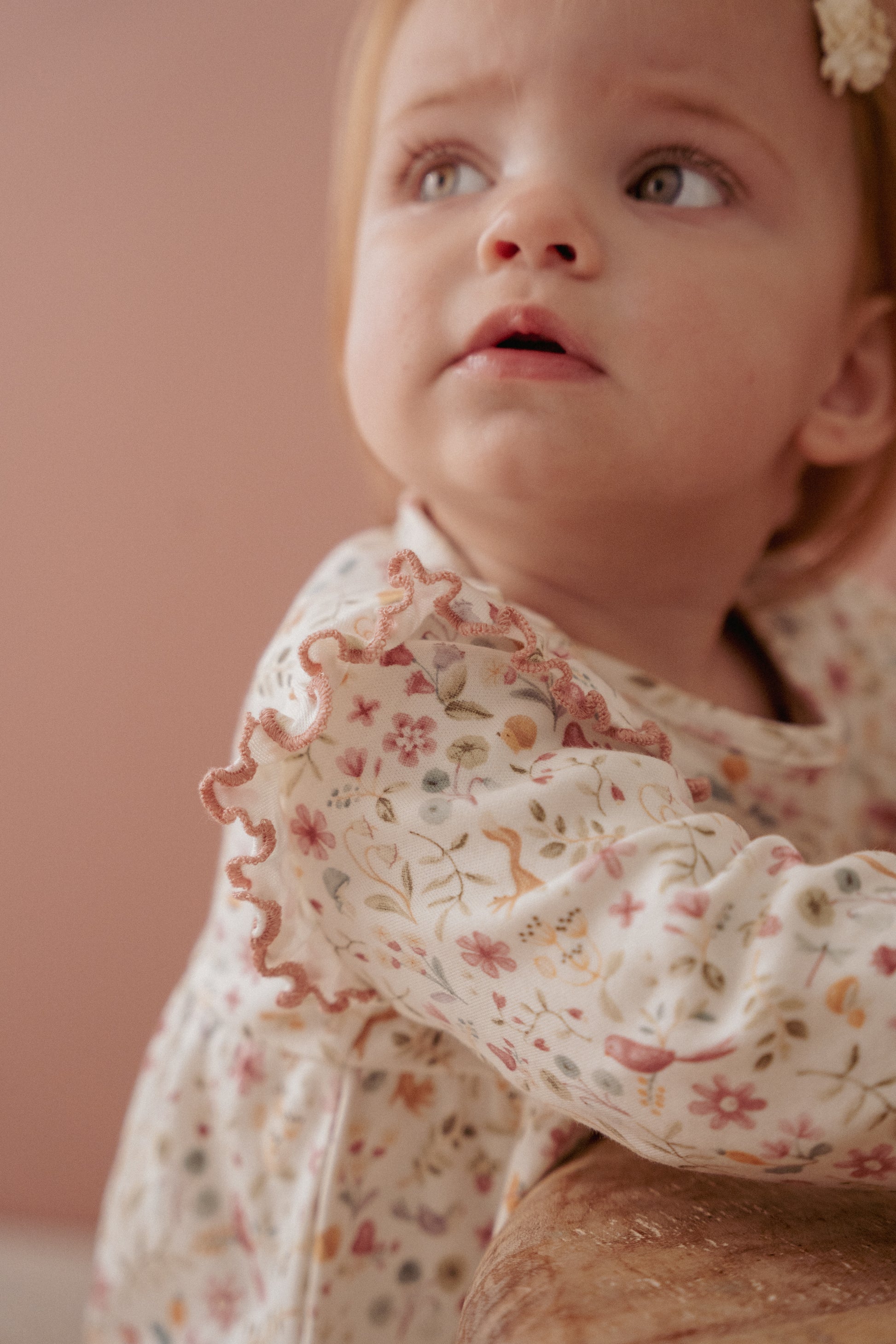 Droom weg in een sprookje van de Fairy Garden! Deze betoverende jurk is gemaakt van zachte, comfortabele stof en heeft een dessin van een magische tuin vol bloemen, blaadjes, eekhoorns, egels, vogels en meer. Het charmante ontwerp heeft schattige ruches op de schouders en de elastische uiteinden van de mouwen zijn voorzien van een extra ruche voor een speels accent. Gemaakt van biologisch katoen, biedt deze jurk je kleintje zowel comfort als stijl. Mix en match met andere items uit de gecoördineerde Fairy Garden-collectie.