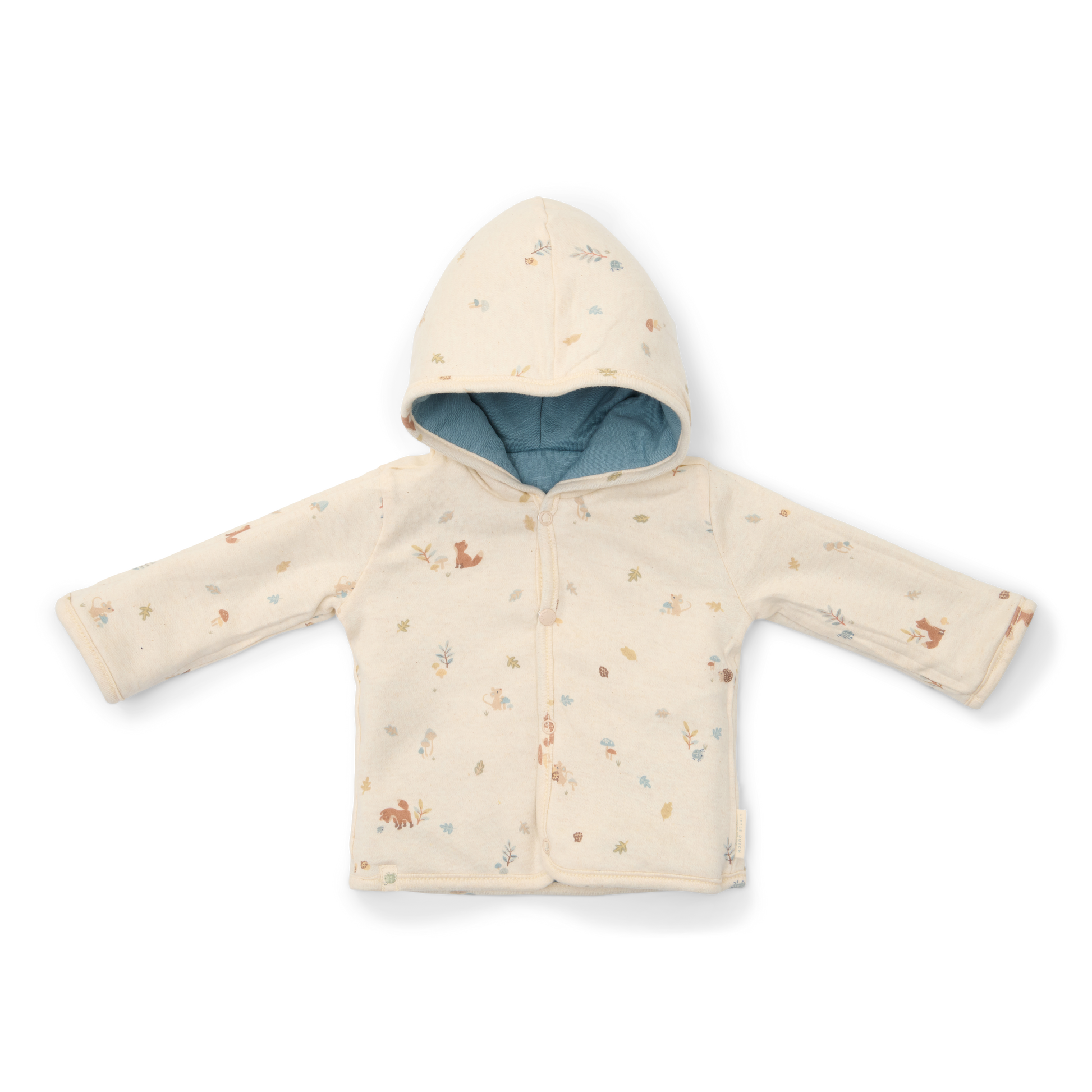 Een laagje stijl voor koudere lentedagen en koele zomeravonden. Deze schattige reversible jas is met zorg en liefde ontworpen voor stijlvol comfort voor je pasgeboren baby. Gemaakt van lichtgewicht en zachte joggingstof, is deze jas perfect om je kleintje warm en knus te houden. Aan de ene kant vind je een subtiele blauwe kleur met zandkleurige boorden, en een klein borduursel van bosblaadjes. Draai het binnenstebuiten en dan komt de mooie Forest Friends-print naar voren, vol bladeren, eikels, paddenstoelen, vossen, egels en meer. Gemaakt van biologisch katoen, licht gewatteerd met een drukknoopsluiting, zorgt deze omkeerbare jas zowel voor comfort als geborgenheid voor je pasgeboren kindje. Het jasje past naadloos bij alle items uit de Forest Friends-collectie.
