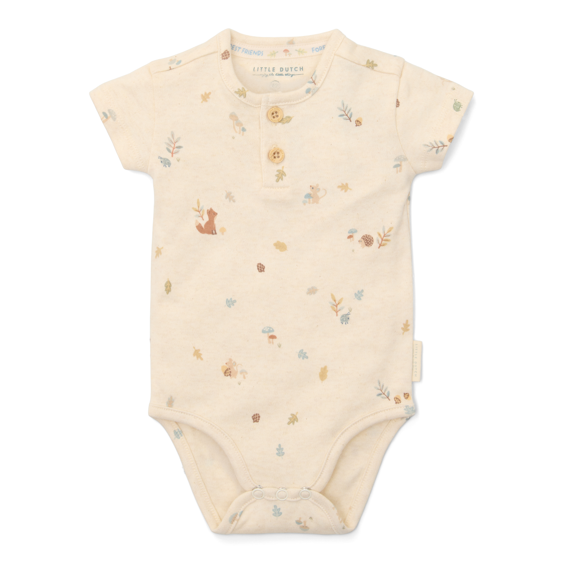Speel, slaap en verken in alle comfort in deze romper met korte mouwen, een echte must-have voor de garderobe van je pasgeboren kindje. De zandkleurige melange is voorzien van het vrolijke Forest Nature dessin dat een vleugje magie toevoegt aan elke outfit. De hout-look knoopjes geven het een landelijke charme. Gemaakt van zacht biologisch katoen, zorgt het voor comfort en zachtheid voor de huid van je baby. Dit rompertje combineert prachtig met elk item uit de Forest Friends-collectie, zodat je eindeloos kunt mixen en matchen.