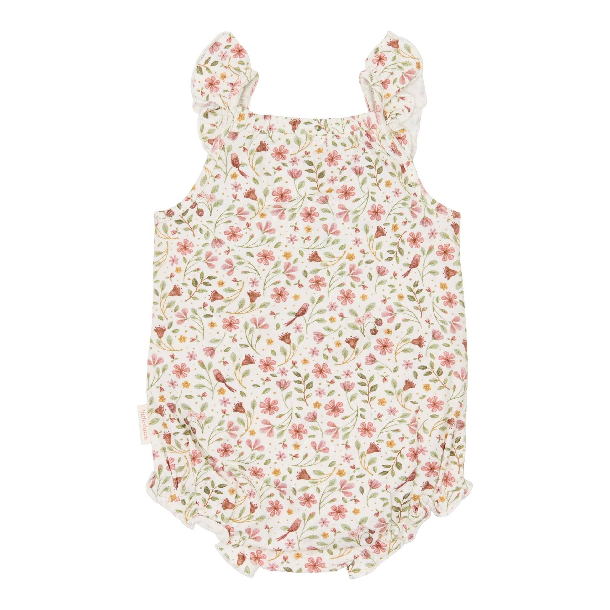 Laat je kleintje stralen in deze mouwloze romper met vrolijke Fairy Garden print. De zachte stof en het lieve strikje maken hem extra bijzonder. De ruches op de schouders geven een speels accent. Gemaakt van biologisch katoen, heerlijk comfortabel op warme dagen. Perfect om te combineren met andere zomerse items uit de collectie.