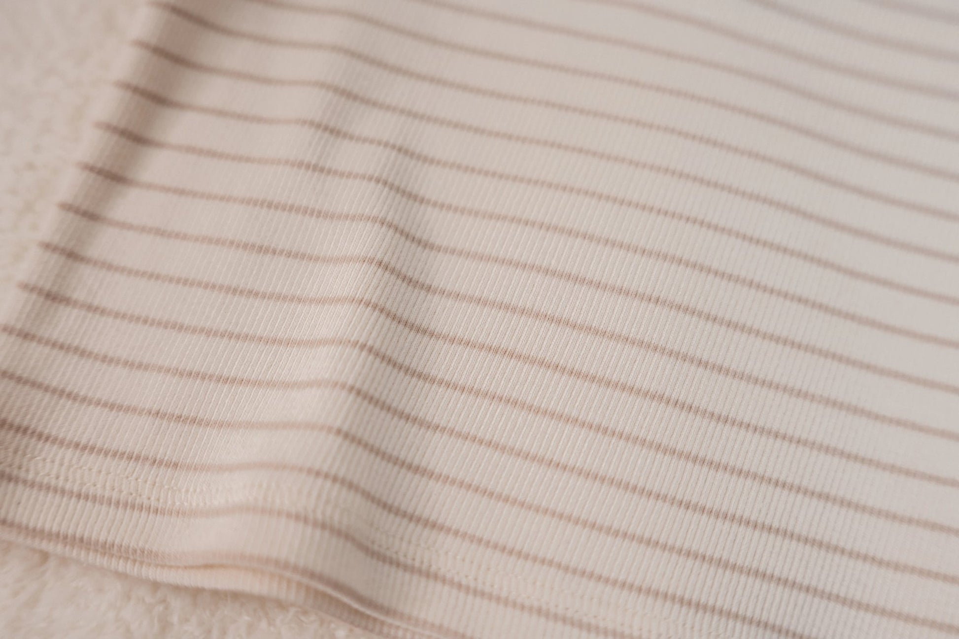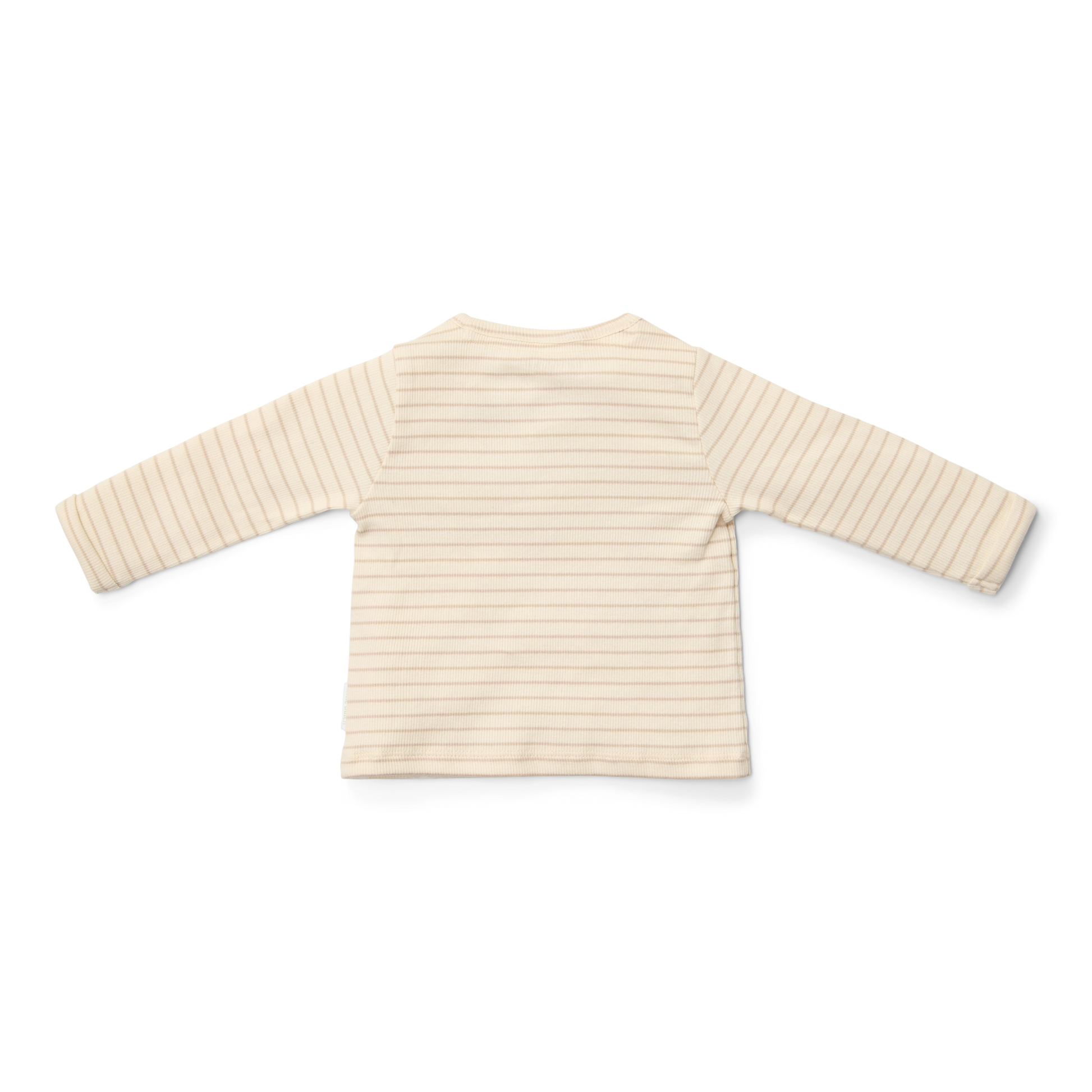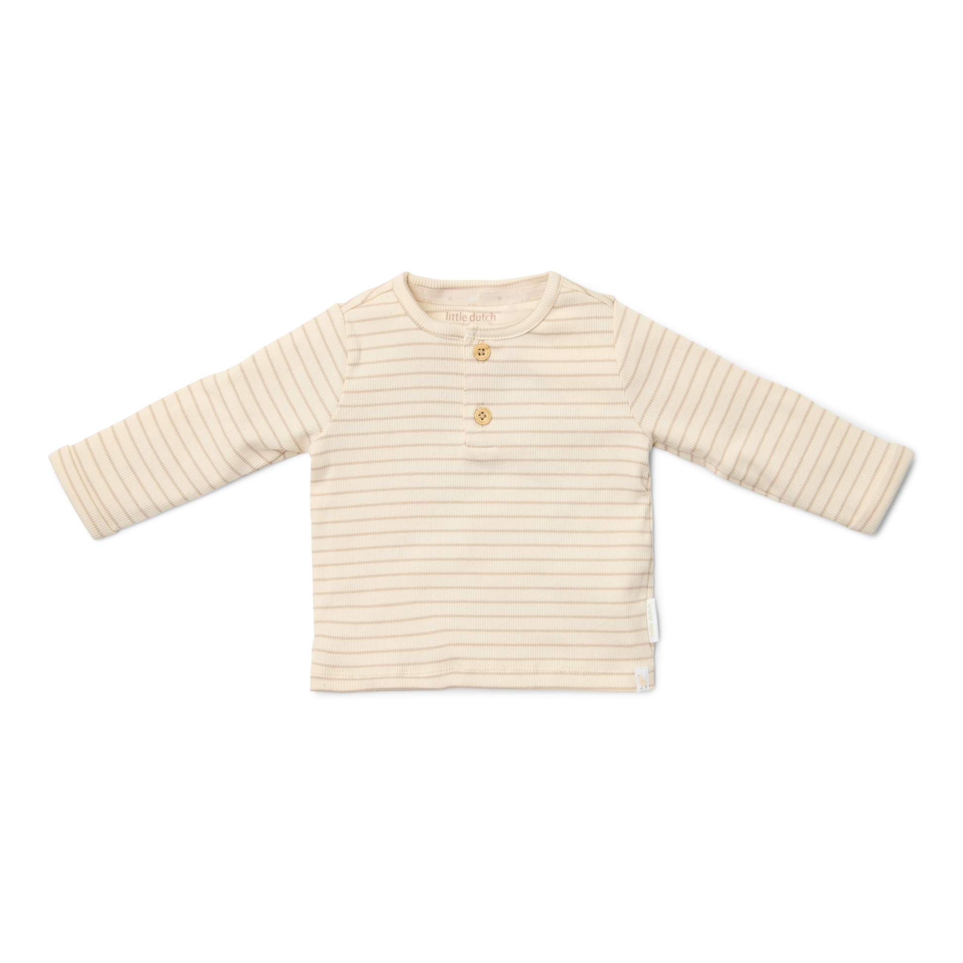 Dit T-shirt met lange mouwen, subtiele zandkleurige strepen en mooie knopen in houtlook geeft de outfit van je kleintje een vleugje charme. Het comfortabele ribmateriaal omhult je kind als een zachte omhelzing, perfect voor zowel speel- als knuffelmomenten. Gemaakt van biologisch katoen en Oekotex gecertificeerd, kun je er zeker van zijn dat dit T-shirt niet alleen vriendelijk is voor de huid, maar ook voor de planeet. Een stijlvolle en verantwoorde keuze voor kleine trendsetters! Verkrijgbaar in de maten 44 t/m 74.