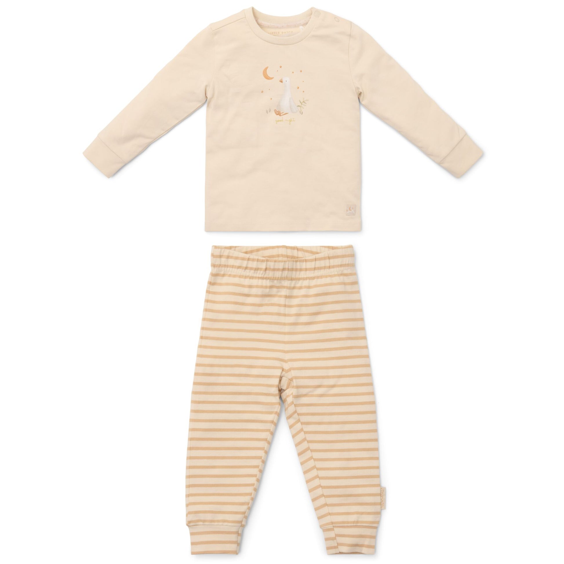 Slaap maar zacht klein gansje: in deze pyjama in neutrale tinten en een schattige gansje ben je zo in dromenland. Deze tweedelige set heeft een printje van witte en beige strepen op de broek, en een charmante print van een slaperige baby gansje op het gebroken witte shirt. Verpakt in een mooie geschenkdoos en verkrijgbaar in maten 62/68, 74/80, 86/92 en 98/104.