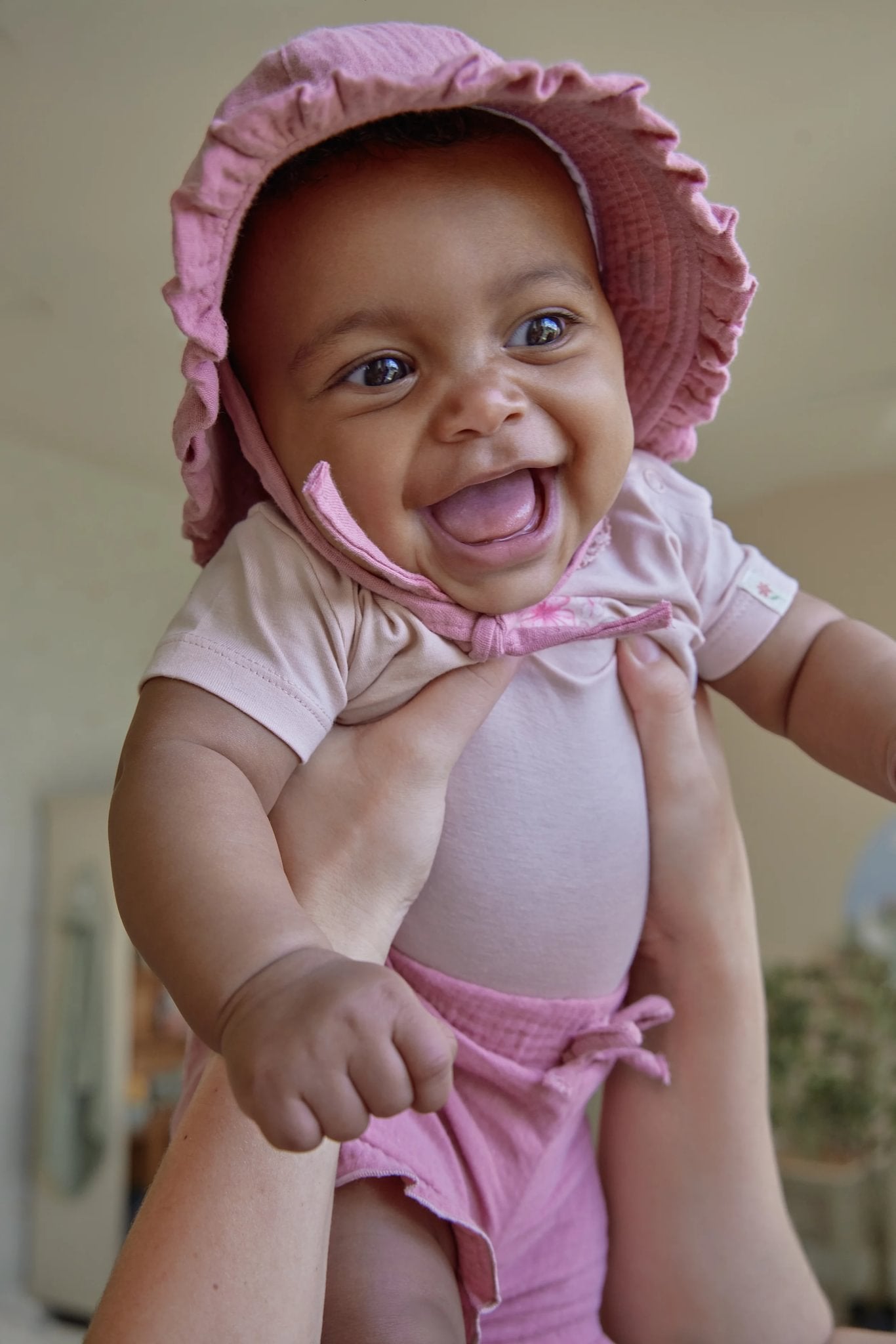 Deze lieve zomerhoed beschermt je kindje tegen de zon en voelt heerlijk zacht aan. De lichte mousseline stof en het geborduurde bloemetje maken hem extra bijzonder. Gemaakt van biologisch katoen, perfect voor warme dagen vol avontuur. Een liefdevol accessoire voor elke kleine ontdekker.
